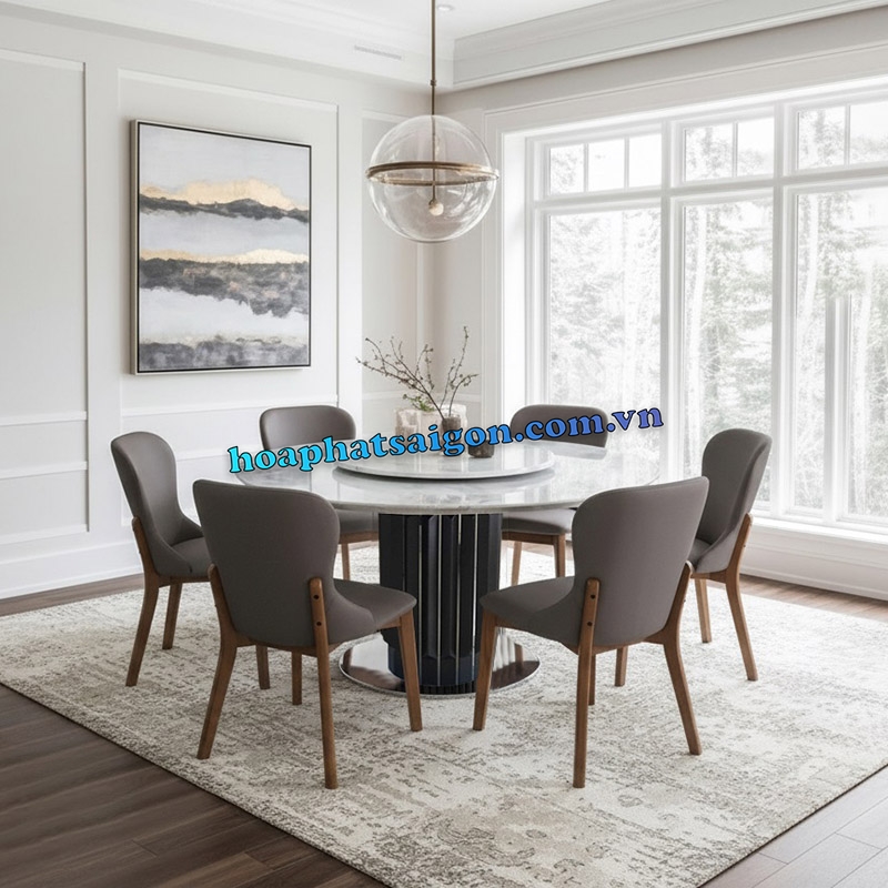 • Bàn ăn cao cấp, mặt đá, có mặt xoay, chân gỗ tự nhiên