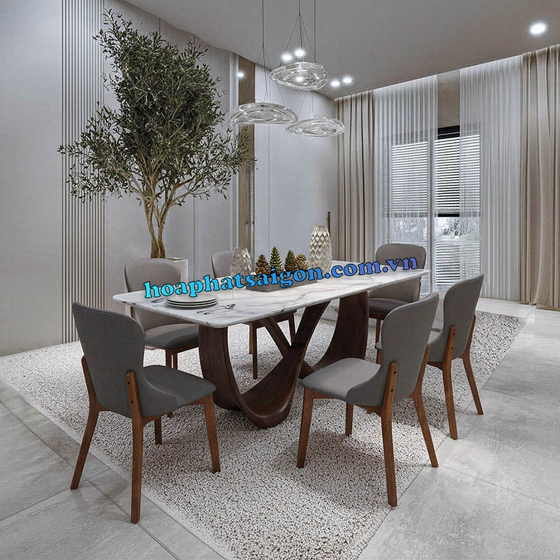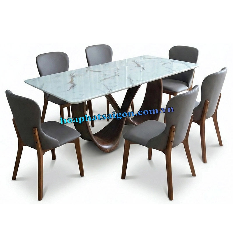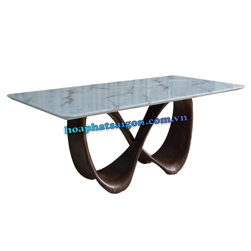 • Bàn ăn cao cấp mặt đá chữ nhật, chân gỗ tự nhiên